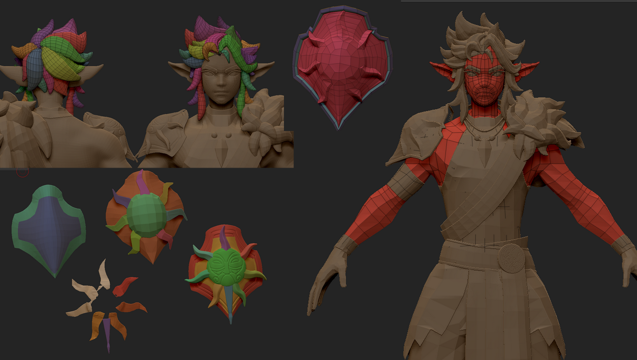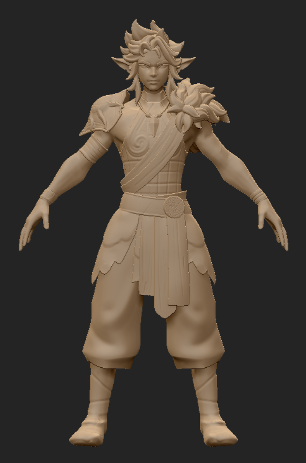 Here it was to find the flow in some areas of the concept such as the fur and hair, or the shoulderpad, that took many trials and errors, a modified plane, a base in Maya, a sphere, the sun rays different meshes, a personal preference is to jump between topogun and zbrush to keep a shape I like and polish to make sense in geometry, same with the body, and plenty of pieces, basically all of them save for the hair and fur, once I had that, then did I went all in on the HP details.