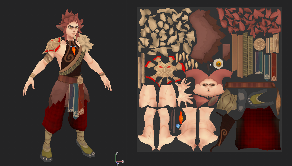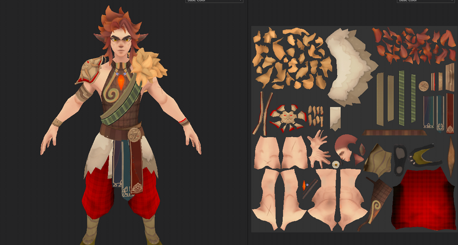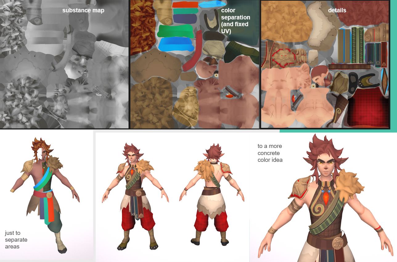 What zbrush to topogun, substance to photoshop, jumping from one to another. Creating a grayscale material that then I can send to photoshop to add colors where it’s way faster to iterate. Once pleased with the result, send it back to Substance Painter for polishing small details and review the PBRs (Physically-Based Rendering) making sure the metal looks metallic, leather rough, etc. Also where I made final tweaks, like giving him a meaner frown or simplifying the colors after getting feedback.